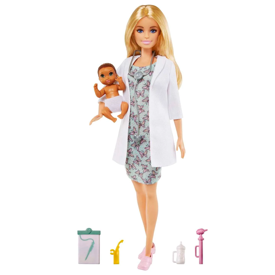 Explore a world of caretaking fun with the Barbie baby doctor playset! When a girl plays with Barbie, she imagines everything she can become, and if you love taking care of babies, you can be a baby doctor! Playset includes the Barbie baby doctor doll (12-in/30.40-cm) who wears a sweet dress with a butterfly pattern and a white doctor’s coat, and her cute infant patient who sports a diaper. Playset also comes with 6 accessories (some of which Barbie baby doctor doll can hold): a stethoscope, thermometer, oscilloscope, chart and a pink baby blanket and baby bottle to keep her patient happy and healthy. Kids will love the endless possibilities for creative expression and storytelling fun! Doll cannot stand alone. Colors and decorations may vary. Makes a great gift for ages 3 years old and up.