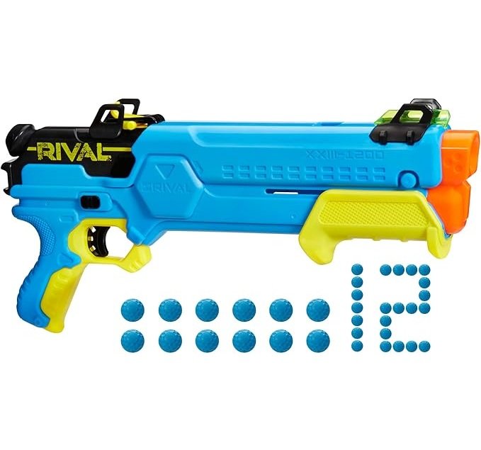 • NERF RIVAL FORERUNNER XXIII-1200 BLASTER: Breech load, spring powered Nerf blaster has 12-round capacity, pump action priming, trigger lock, and fires rounds at a velocity of 90 feet per second